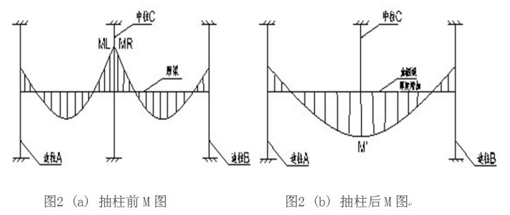 1、拔柱后結(jié)構(gòu)內(nèi)力變化分析:拔柱后該柱上部梁的跨度增加,同時(shí)內(nèi)力也會隨之發(fā)生較大的變化。如圖2(a)所示,拔柱前該柱兩側(cè)的梁截面承受較大的負(fù)彎矩和正彎矩;拔柱后卻承受較大的正彎矩;另外,拔柱前后結(jié)構(gòu)形式發(fā)生改變,導(dǎo)致原來梁的配筋不滿足設(shè)計(jì)復(fù)核要求。結(jié)構(gòu)的受力傳遞路徑在拔柱后也會發(fā)生改變,一般有兩種情況:1.原結(jié)構(gòu)僅在一個(gè)方向是主框架平面,則所拔柱上的荷載絕大部份將傳遞給主框架平面兩邊的柱;2.原結(jié)構(gòu)在兩個(gè)方向均為主框架平面,則所拔柱上的荷載將通過兩個(gè)方向的框架梁傳遞給周邊相鄰的四個(gè)柱子。