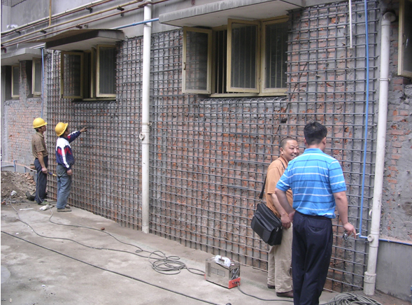 對于抗震驗算需配筋的墻體:先將原粉刷層打掉,清除松散砂漿及浮灰,水沖無浮灰;按設計要求掛鋼筋網(wǎng),用M10水泥砂漿抹面35厚內(nèi)摻水泥用量1%礦棉纖維。