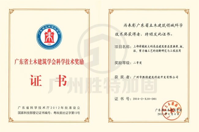 廣東省土木建筑學會科學技術二等獎-科學技術獎勵證書-廣州市勝特建筑科技開發(fā)有限公司資質(zhì)證書展示,勝特加固公司榮譽一覽.我司專注于危房加固,橋梁承臺加固等工程設計及施工,擁有建筑加固資質(zhì),加固資質(zhì)證書等一系列特種工程資質(zhì).公司加固技術實力雄厚,國家高新技術企業(yè),獲科學技術獎勵證書!歡迎來電咨詢加固工程業(yè)務