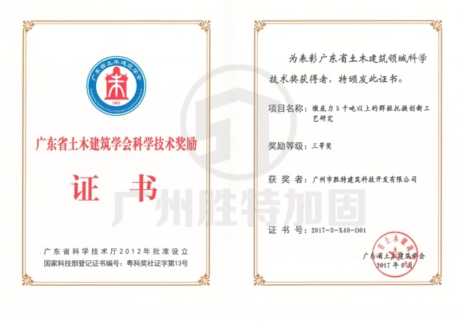 廣州市勝特建筑科技開發(fā)有限公司榮獲廣州市科學(xué)技術(shù)獎“墩底力5千噸以上的群樁托換創(chuàng)新工藝研究”科技獎勵榮譽(yù)證書
