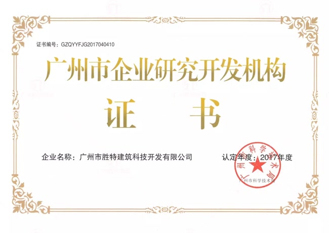 廣州市勝特建筑科技開發(fā)有限公司(以下簡稱“我司”)榮獲由廣州市科學(xué)技術(shù)局頒發(fā)的“廣州市企業(yè)研究開發(fā)機構(gòu)”稱號。我司憑借嚴(yán)密的科研組織機構(gòu)、高層次的研發(fā)團隊、大量的研發(fā)投入、專業(yè)的研發(fā)科室及自主知識產(chǎn)權(quán)多項發(fā)明專利等,順利通過專家的評審,最終獲得該榮譽稱號。