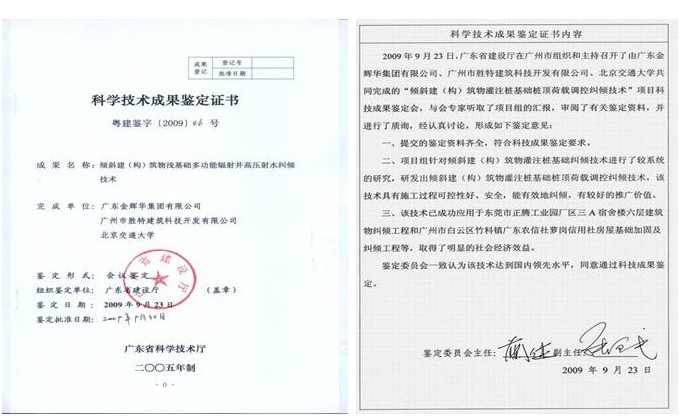 本技術(shù)于2009年9月23日榮獲廣東省建設(shè)廳鑒定的科技成果鑒定證書,鑒定結(jié)果為國內(nèi)領(lǐng)先水平。本技術(shù)適用于具有灌注構(gòu)筑物糾傾,糾傾時在相反一側(cè)設(shè)計斷樁區(qū)域調(diào)整千斤頂?shù)纳灯仁沟郊m傾目的。現(xiàn)已申請國家實用新型專利,且已成功應用于我司的東莞市正騰工業(yè)園廠區(qū)三A宿舍樓六層建筑物糾傾工程、廣州市農(nóng)村信用聯(lián)社蘿崗信用社糾傾加固工程等。