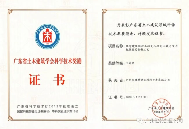 近日,由我司申報的“既有建筑物樁基礎(chǔ)復(fù)壓提高承載力變?yōu)橥袚Q樁的創(chuàng)新工藝”項目榮獲2020年廣東省土木建筑學(xué)會科學(xué)技術(shù)獎勵三等獎。