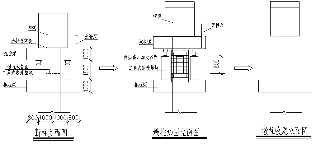 3.3.2若橋梁為下部結(jié)構(gòu)為樁柱式基礎(chǔ),且橋臺(tái)下有錐坡,直接搭設(shè)支架不便,施工時(shí)可采取以下方案:采用上——下抱柱梁頂升力系的方法,將頂升著力點(diǎn)設(shè)在抱柱梁底面,再將墩柱切斷后,通過(guò)頂升抱柱梁來(lái)改變橋面標(biāo)高,頂升完成后連接并加強(qiáng)墩柱。