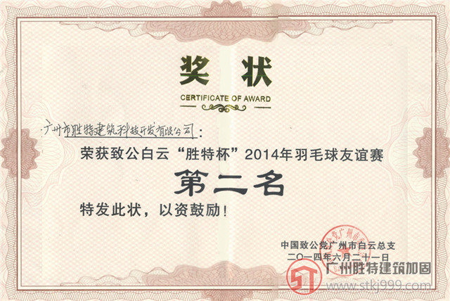 致公白云“勝特杯”羽毛球賽第二名-廣州市勝特建筑科技開發(fā)有限公司資質(zhì)證書展示,勝特加固公司榮譽一覽.我司專注于危房加固,橋梁承臺加固等工程設(shè)計及施工,擁有建筑加固資質(zhì),加固資質(zhì)證書等一系列特種工程資質(zhì).公司加固技術(shù)實力雄厚,國家高新技術(shù)企業(yè),歡迎來電咨詢加固工程業(yè)務(wù)