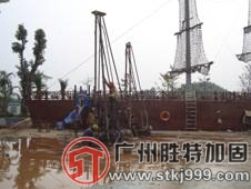 廣州加固公司-勝特加固典型地基加固實(shí)例-夏灣拿酒店游泳池加固工程: 泳池建成后,在蓄水后的使用過程中,由于地基承載力不足發(fā)生較嚴(yán)重的沉降現(xiàn)象,同時(shí)由于沉降產(chǎn)生的泳池裂縫導(dǎo)致池水嚴(yán)重滲漏,故急需進(jìn)行地基基礎(chǔ)加固、裂縫修復(fù)施工。東方夏灣拿花園酒店游泳池位于酒店西側(cè),大體呈三角形,其中兩直角邊緊臨酒店主體結(jié)構(gòu)。泳池水面面積1500m2,設(shè)計(jì)水深0.6~1.2m。水池整體置于約4.5m厚的回填土之上?;靥钔敛捎盟赡緲稊D密處理,木樁直徑為Φ300,設(shè)計(jì)樁長4m,實(shí)際入土深度約2.0m。泳池底板為整體現(xiàn)澆鋼筋混凝土底板,板厚250mm,混凝土強(qiáng)度等級為C25。我公司技術(shù)研發(fā)部門嚴(yán)格設(shè)計(jì)地基加固方案、各部門各方通力合作,該酒店游泳池加固成功完成。
