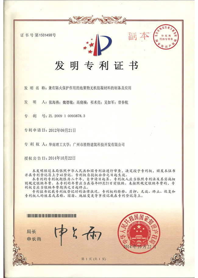 兼有隔火保護(hù)作用的地聚物無機膠凝材料的制備及應(yīng)用