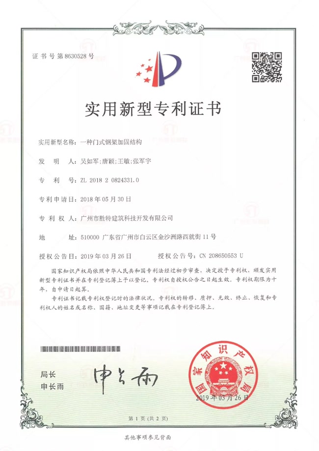 由廣州勝特加固公司董事長(zhǎng)吳如軍先生帶領(lǐng)技術(shù)研發(fā)團(tuán)隊(duì)共同研發(fā)的“一種門(mén)式鋼架加固結(jié)構(gòu)”于2019年3月26日獲中華人民共和國(guó)國(guó)家知識(shí)產(chǎn)權(quán)局授予實(shí)用新型專(zhuān)利證書(shū)。專(zhuān)利號(hào):ZL201820824331.0。