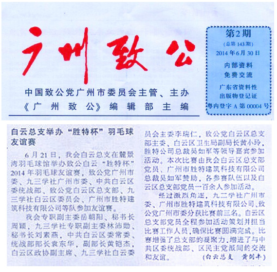 6月21日,在麓景灣羽毛球館我會(huì)白云總支舉辦致公白云“勝特杯”2014年羽毛球友誼賽,致公黨廣州市委、九三學(xué)社廣州市委、中共白云區(qū)委統(tǒng)戰(zhàn)部、致公黨白云區(qū)總支部、九三學(xué)社白云區(qū)委員會(huì)、廣州市勝特建筑科技有限公司等隊(duì)參加友誼賽。