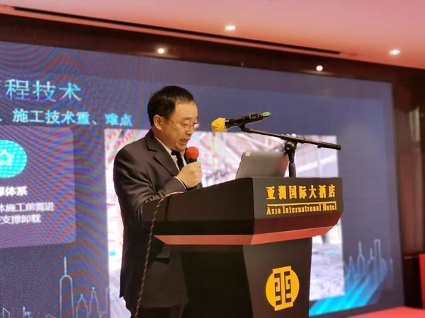 趙正興副總工程師做《亞洲國(guó)際大酒店超長(zhǎng)跨度宴會(huì)廳托梁拔柱工程設(shè)計(jì)與施工》的匯報(bào)