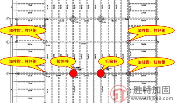 通過增設(shè)托換梁將兩根柱所承擔(dān)的荷載通過梁系轉(zhuǎn)換至周邊的豎向構(gòu)件。