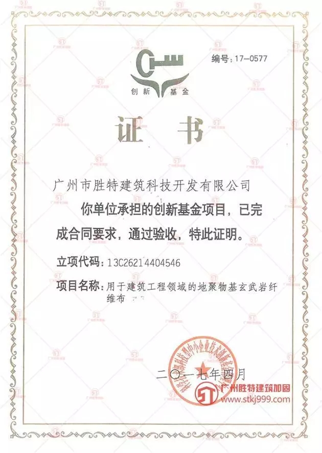 近日,廣州市勝特建筑科技開發(fā)有限公司與華南理工大學產(chǎn)學研合作的“用于建筑工程領域的地聚物基玄武巖纖維布”項目獲得國家科技型中小企業(yè)技術創(chuàng)新基金驗收證書(立項代碼:13C26214404546)。 玄武巖連續(xù)纖維簡稱CBF或BF,是以天然玄武巖礦石為原料,將礦石破碎后加入熔窯中,經(jīng)高溫熔融后,通過高速拉制而成的連續(xù)纖維。玄武巖連續(xù)纖維是一種新型綠色環(huán)保材料,相對于土木工程加固領域廣泛使用的碳纖維,具有以下優(yōu)點: 1)綠色環(huán)保。 2)生產(chǎn)能耗低。 3)具有自主知識產(chǎn)權。由于碳纖維原絲的生產(chǎn)技術核心被少數(shù)幾個國家控制,我國的碳纖維原絲依賴進口,因此價格昂貴。而玄武巖纖維是我國在高性能纖維領域唯一具有自主知識產(chǎn)權的增強纖維,我司與華南理工共同擁有發(fā)明專利《兼有隔火保護作用的地聚物無機膠凝材料的制備及應用》。 4)良好的耐高溫性能。 5)低熱傳導性。 我司成立20年來,公司領導對科研工作高度重視。本項目在廣州市科創(chuàng)委專家組的高度評價中順利驗收,得到了國家科技部門的充分肯定和支持,充分體現(xiàn)著我司的科研綜合實力和以科研推動施工技術進步,以施工技術實踐轉換科技成果的市場競爭力,這對我司全體同仁是極大的鼓舞。我司將持續(xù)創(chuàng)新,加大研發(fā)力度,力爭在資助項目上獲得新的突破,再上一個新臺階,推動本行業(yè)學科向更高層次發(fā)展。