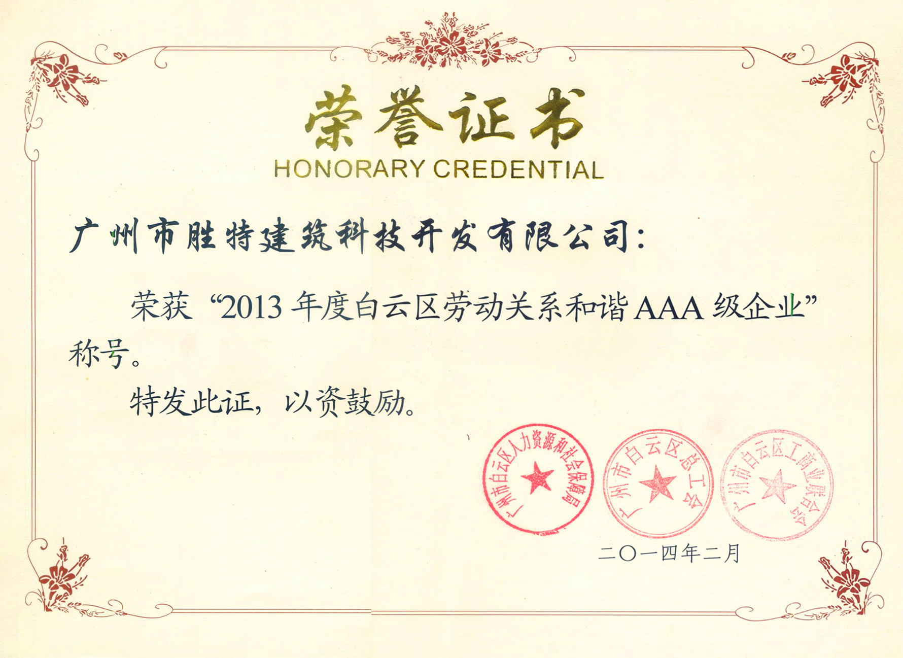 2014年2月28日,廣州市勝特建筑科技開發(fā)有限公司應邀參與白云區(qū)工商聯(lián)(總商會)十屆六次執(zhí)委會暨“創(chuàng)新與轉型”經(jīng)濟論壇。會上廣州市白云區(qū)人力資源和社會保障局、廣州市白云區(qū)總工會、廣州市白云區(qū)工商業(yè)聯(lián)合會(總商會)向我司頒發(fā)了“2013年度白云區(qū)勞動關系和諧AAA級企業(yè)”證書。