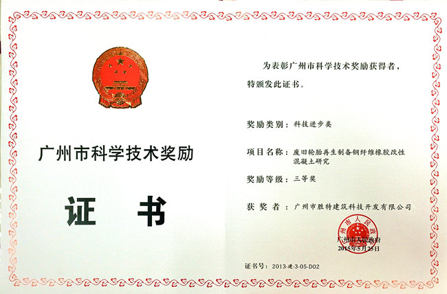 勝特建筑加固公司和廣東工業(yè)大學(xué)產(chǎn)學(xué)研合作申報(bào)的“廢舊輪胎再生制備鋼纖維橡膠改性混凝土研究” 獲頒2013年度廣州市科學(xué)技術(shù)三等獎。董事長吳如軍先生、副董事長曾春航先生作為主要完成人對本項(xiàng)目進(jìn)行了研究與工程應(yīng)用。