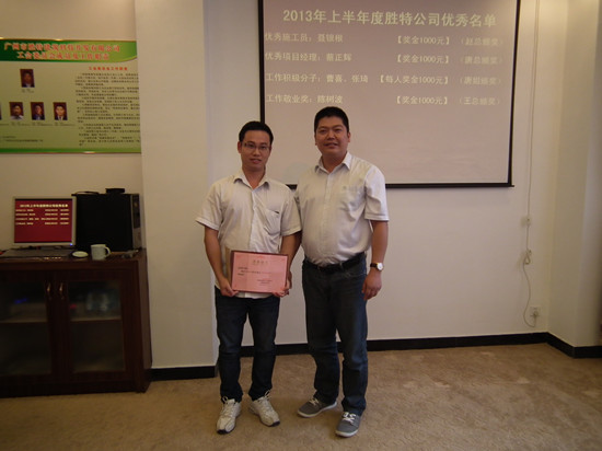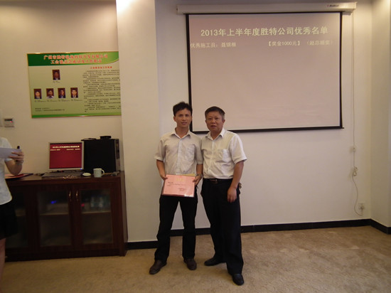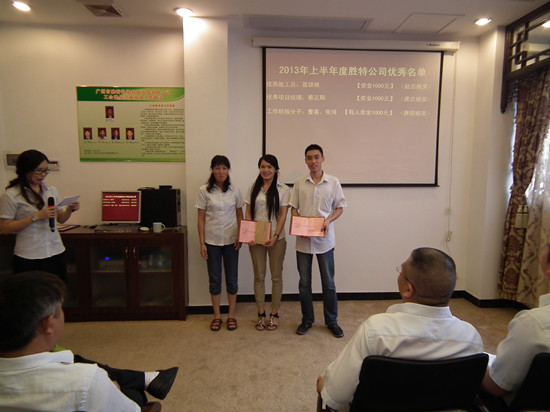 報(bào)告完畢后是勝特公司2013年上半年度優(yōu)秀員工頒獎(jiǎng),個(gè)人獲獎(jiǎng)?wù)哂校簝?yōu)秀施工員,優(yōu)秀項(xiàng)目經(jīng)理,工作積極分子分別為張琦和、工作敬業(yè)獎(jiǎng)、網(wǎng)絡(luò)營(yíng)銷微博優(yōu)秀獎(jiǎng);綜合研發(fā)中心獲得了部門獎(jiǎng)項(xiàng):積極響應(yīng)表現(xiàn)優(yōu)異獎(jiǎng)。