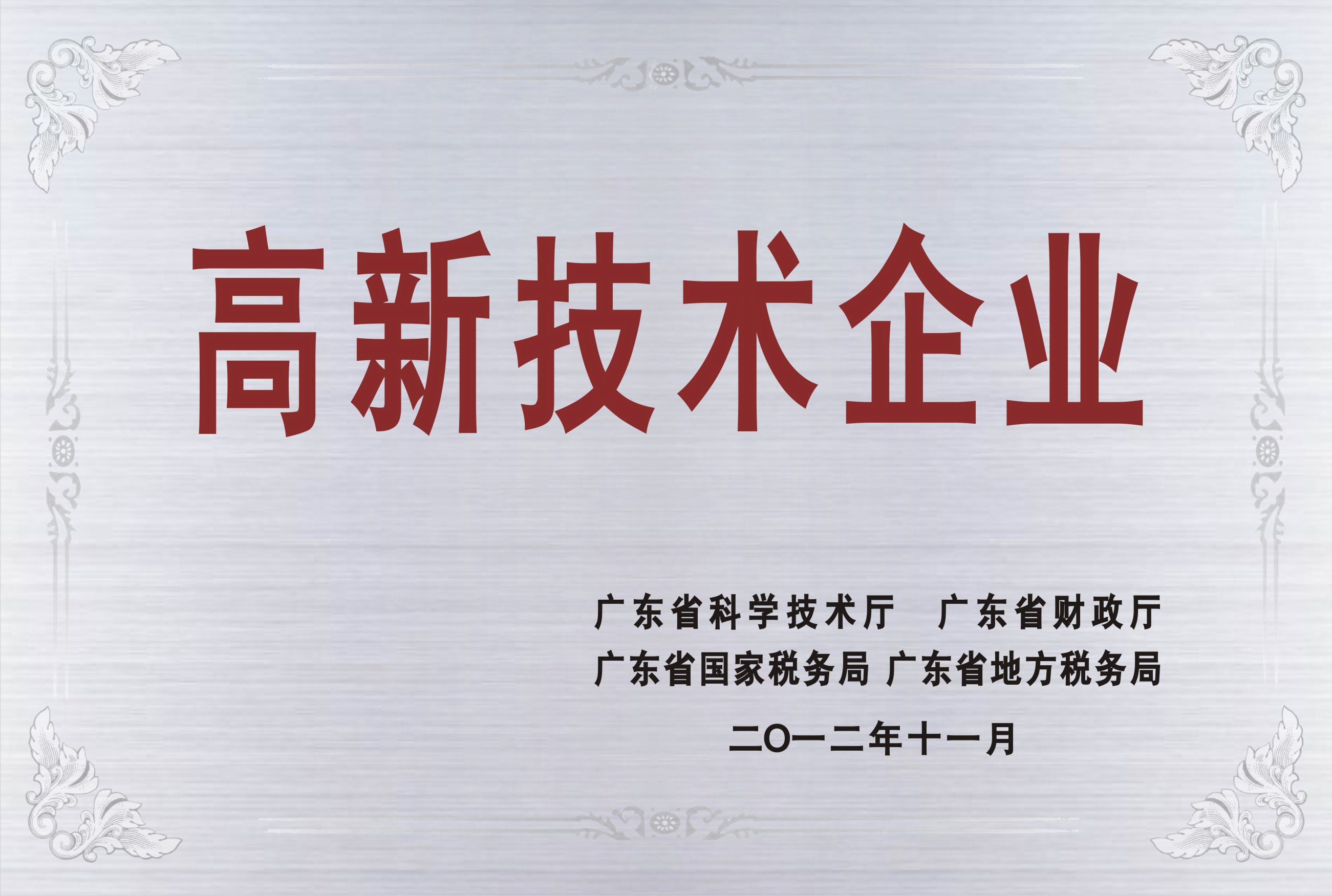 2013年5月6日,按國(guó)務(wù)院的有關(guān)規(guī)定。廣東省科學(xué)技術(shù)廳、廣東省財(cái)政廳、廣東省國(guó)家稅務(wù)局及廣東省地方稅務(wù)局聯(lián)合向我司等542家首批獲得《高新技術(shù)企業(yè)》稱號(hào)的廣東企業(yè)頒發(fā)《高新技術(shù)企業(yè)證書》及牌匾。