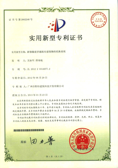 由勝特加固公司董事長(zhǎng)吳如軍先生、副董事長(zhǎng)曾春航先生共同發(fā)明的專(zhuān)利《新修隧道穿越既有建筑物的托換系統(tǒng)》于2013年1月23日受?chē)?guó)家知識(shí)產(chǎn)權(quán)局授權(quán)。