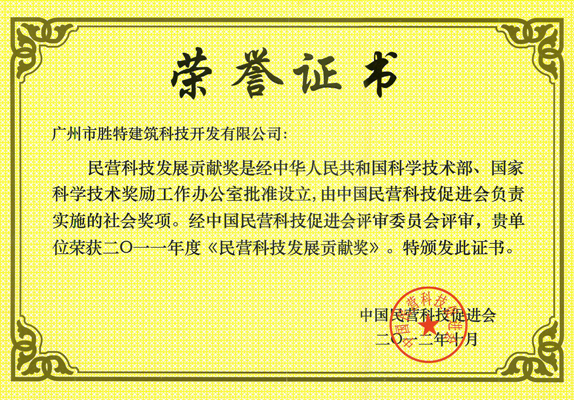 在廣州市生產(chǎn)力促進中心的關(guān)心下,勝特建筑加固積極主動參加科學(xué)技術(shù)部和國家科學(xué)技術(shù)獎勵工作辦公室批準(zhǔn)設(shè)立,由中國民營科技促進會評審頒發(fā)的2011年度“民營科技發(fā)展貢獻獎”評選活動。并順利通過評選,榮獲“全國優(yōu)秀民營科技企業(yè)”稱號。