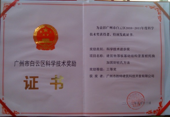 吳錦明副區(qū)長首先總結(jié)了全區(qū)2010-2011年度科技和信息化的工作情況;區(qū)委常委、常務(wù)副區(qū)長鐘向東宣讀了授予廣州市勝特建筑科技開發(fā)有限公司“建筑物厚板基礎(chǔ)結(jié)構(gòu)豎直樁托換加固封樁孔方法”等20個(gè)項(xiàng)目廣州市白云區(qū)2010-2011年度科學(xué)技術(shù)獎(jiǎng)的表彰通報(bào);省、市科技部門領(lǐng)導(dǎo)和區(qū)五套班子有關(guān)領(lǐng)導(dǎo)親自向獲獎(jiǎng)單位頒發(fā)白云區(qū)2010-2011年度科學(xué)技術(shù)獎(jiǎng),我司董事長兼總經(jīng)理吳如軍等代表依次登臺(tái)領(lǐng)獎(jiǎng),勝特建筑加固憑借雄厚的技術(shù)實(shí)力、豐富的工程案例,獲此殊榮是實(shí)至名歸。