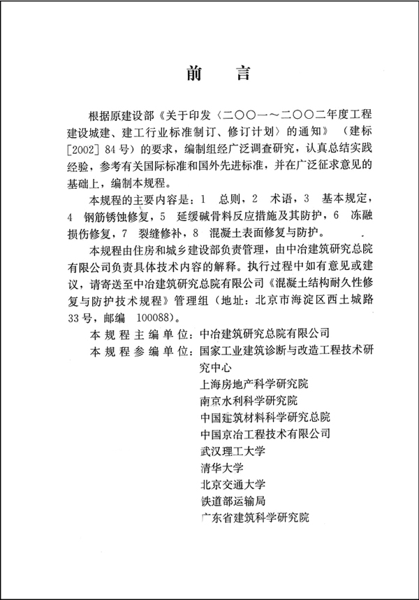 根據(jù)原建設部《關(guān)于印發(fā)<二〇〇一~二〇〇二年度工程建設城建、建工行業(yè)標準制訂、修訂計劃>的通知》(建標[2002]84號)的要求,編制組經(jīng)廣泛調(diào)查研究,認真總結(jié)實踐經(jīng)驗,參考有關(guān)國際標準和國外先進標準,并在廣泛征求意見的基礎上,編制本規(guī)程。本規(guī)程的主要內(nèi)容是:1總則,2術(shù)語,3基本規(guī)定,4鋼筋銹蝕修復,5延緩堿骨料反應措施及其防護,6凍融損傷修復,7裂縫修補,8混凝土表面修復與防護。本規(guī)程由住房和城鄉(xiāng)建設部負責,由中冶建筑研究總院有限公司負責具體技術(shù)內(nèi)容的解釋。執(zhí)行過程中如有意見或建議,請寄送至中冶建筑研究總院有限公司《混凝土結(jié)構(gòu)耐久性修復與防護技術(shù)規(guī)程》管理組(地址:北京市海淀區(qū)西土路33號,郵編:100088)。