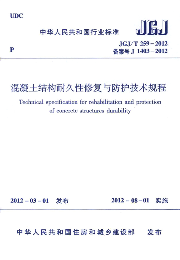 《混凝土結(jié)構(gòu)耐久性修復與防護技術(shù)規(guī)程》JGJ/T259-2012于2006年開始編制,終于在2012年3月1日發(fā)布,于8月1日開始實施,現(xiàn)在各大書店有售。