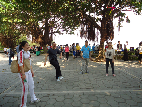 在半山腰的小廣場上大家玩游戲,踢毽子,觀景。