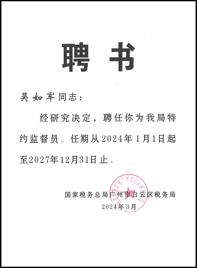 我司吳如軍董事長連續(xù)被聘為白云區(qū)稅務局特約監(jiān)督員