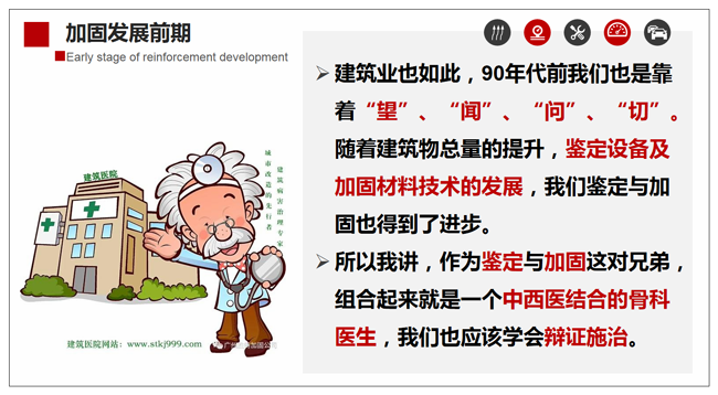 剛才前面講的三個方面,鑒定、加固設(shè)計和加固施工。實際上是兩個大的方面,鑒定和加固,因為加固設(shè)計和加固施工都是屬于加固。鑒定與加固就像現(xiàn)在用高科技精度儀器的醫(yī)生,像中西醫(yī)結(jié)合來完成我們整個加固的工作,我們需要去分析、考慮,做到辯證施治。