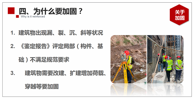 但是技術(shù)人員必須清楚,一旦進行鑒定,就需要對鑒定的結(jié)果負責,而不是簡單的走個過場,簽完名就算完事了。那這樣有可能在10年后因為這個疏忽而找到你,這是我們進行鑒定加固的底線。像很多建筑物的普查,找了一些鑒定行業(yè)外的人士進行,簡單的登記簽名就算完成,不應(yīng)該這樣做的,這樣對我們國家建筑物未來的安全檔案建立以及安全保障來說,是不可取的。