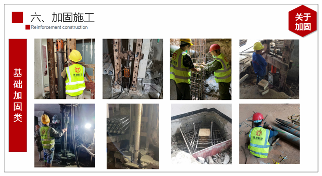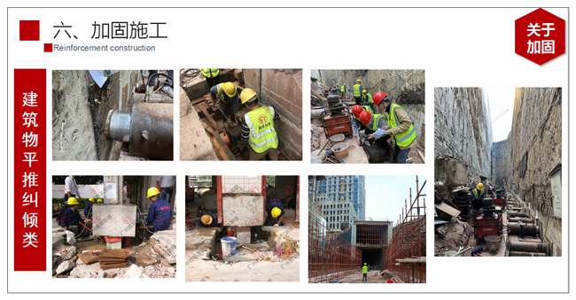 圖中是我們的一些施工圖片,有錨桿靜壓樁,錨桿靜壓樁可以在一個(gè)小廁所里邊用個(gè)架子,就能利用建筑物的荷載把樁給壓下去,把建筑物給穩(wěn)定起來。