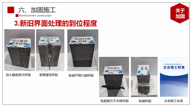 裂縫修復(fù)的首先進(jìn)行裂縫封閉,鑿成個(gè)v型槽,再用一個(gè)皮管就往前抽,抽完之后它會(huì)形成一個(gè)漏漿的通道,在灌漿的時(shí)候,漿會(huì)順著通道滲入到裂縫里面去,這樣就保證了界面的新面。比如,有一個(gè)二三十年的樓房,通過二三十年的碳化,表面浮漿層原本是1-2毫米的厚度,有可能碳化到又多了一到二毫米。所以把碳化成浮漿層的都鑿掉,這樣才保證是一個(gè)完整的工藝。像外包鋼、粘碳纖維等都需要這樣的做法才能夠保證質(zhì)量,我們也做了粘膠配比不合格樣板,因?yàn)檎衬z的配比不對(duì),以及打磨之后灰塵沒清理干凈,粘上去了之后,因?yàn)橛谢覊m粘不了,一拉就下來了。粘鋼也是表面浮漿層打磨了之后粘貼好的,同時(shí)鋼板也是要打磨的,這樣才能夠粘貼的更好。