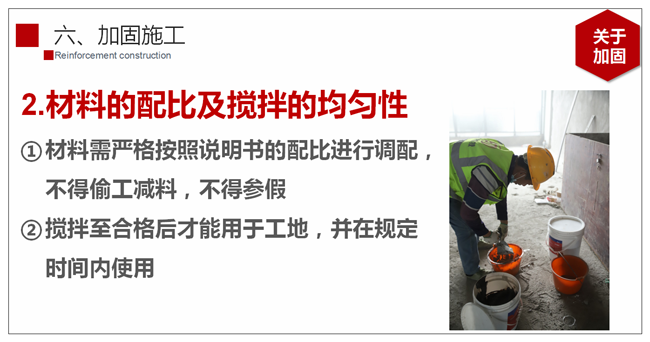 材料需嚴(yán)格按照說明書的配比進(jìn)行調(diào)配,用電子稱進(jìn)行稱量,不得偷工減料,不得參假,攪拌至合格后才能用于工地,并在規(guī)定時(shí)間內(nèi)使用。