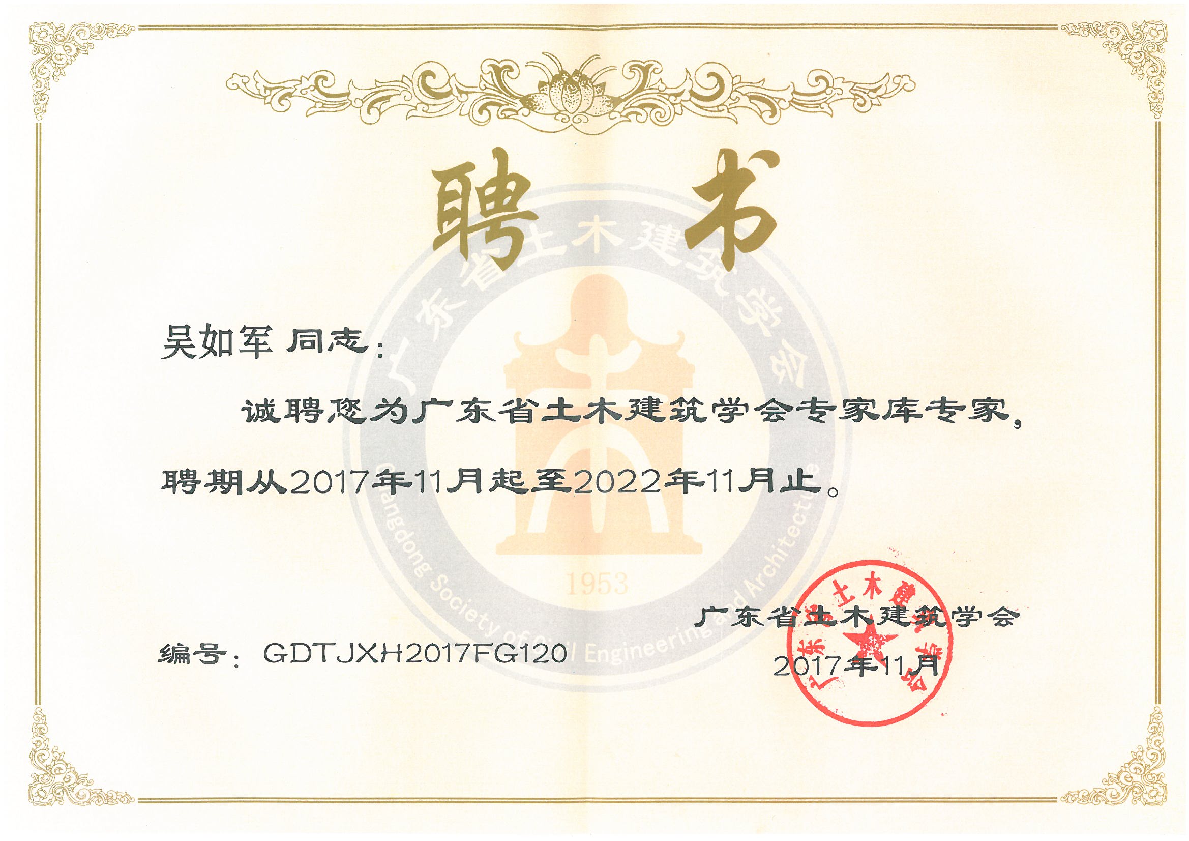 在從業(yè)的二十余年間,吳董事長從沒間斷過在建筑物的病害治理及加固改造托換糾傾領域堅持不懈的努力,獲得十余項國家專利,多項工法與科技成果,參編多本規(guī)范與行業(yè)叢書,發(fā)表多篇有價值的行業(yè)論文,為行業(yè)發(fā)展做出了貢獻。先后獲得全國民營科技發(fā)展貢獻獎、廣東省科學技術獎、土木建筑學會頒發(fā)的“第三屆詹天佑故鄉(xiāng)杯”、廣東省土木建筑學會科學技術獎、廣州市科學技術獎、廣州市白云區(qū)科學技術獎,廣東省土木建筑學會工程施工專業(yè)委員會頒發(fā)“先進個人稱號”,“廣東省工程防水與加固專家委員會專家?guī)?rdquo;專家等多個獎項。 此次受聘為“廣東省土木建筑學會專家?guī)?/span>”專家更是對吳董事長工作的肯定。
