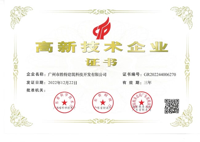 熱烈祝賀廣州市勝特建筑科技開(kāi)發(fā)有限公司再次被評(píng)定為國(guó)家級(jí)高新技術(shù)企業(yè)