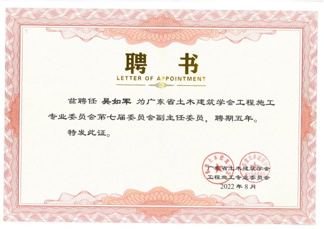 在本次會(huì)議中,我司榮獲“廣東省土木建筑學(xué)會(huì)第六屆工程施工專業(yè)委員會(huì)先進(jìn)單位”榮譽(yù)稱號(hào);我司董事長(zhǎng)吳如軍獲“廣東省土木建筑學(xué)會(huì)工程施工專業(yè)委員會(huì)先進(jìn)個(gè)人”稱號(hào)及連任廣東省土木建筑學(xué)會(huì)工程施工專業(yè)委員會(huì)第七屆委員會(huì)副主任委員。