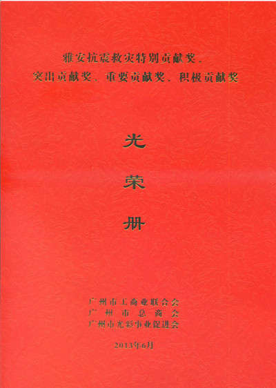 2013年6月14日,我司得到由廣州市工商業(yè)聯(lián)合會、廣州市總商會、廣州市光彩事業(yè)促進會給授予“雅安抗震救災重要貢獻獎”,公司的名稱同時被錄入“光榮冊”中。這是給予我司最大的鼓舞,往后的日子里,我司將加快企業(yè)自身的發(fā)展,持續(xù)承擔社會責任。
