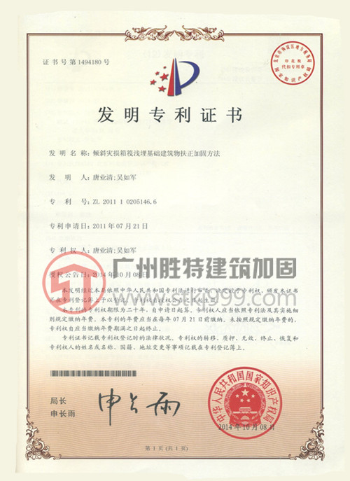 由勝特公司董事長吳如軍先生、技術(shù)顧問唐業(yè)清教授共同發(fā)明的“傾斜災(zāi)損箱筏淺埋基礎(chǔ)建筑物扶正加固方法”,于2014年10月08日中華人民共和國國家知識(shí)產(chǎn)權(quán)局授予專利權(quán)。加固專利。
