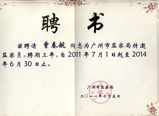 2011年7月12日下午由廣州市監(jiān)察局頒發(fā)證書儀式,我司副董事長曾春航先生參加了此次會(huì)議并領(lǐng)取了證書。