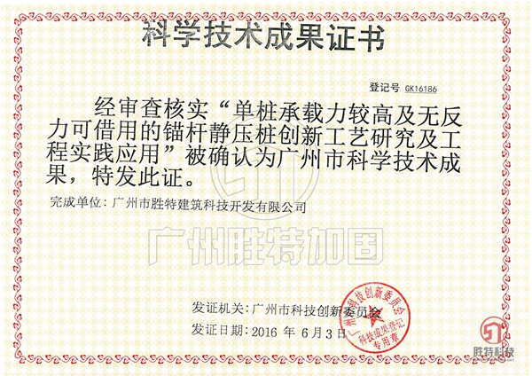 熱烈祝賀我司“單樁承載力較高及無反力可借用的錨桿靜壓樁創(chuàng)新工藝研究及工程實踐應(yīng)用”榮獲廣州市科技成果