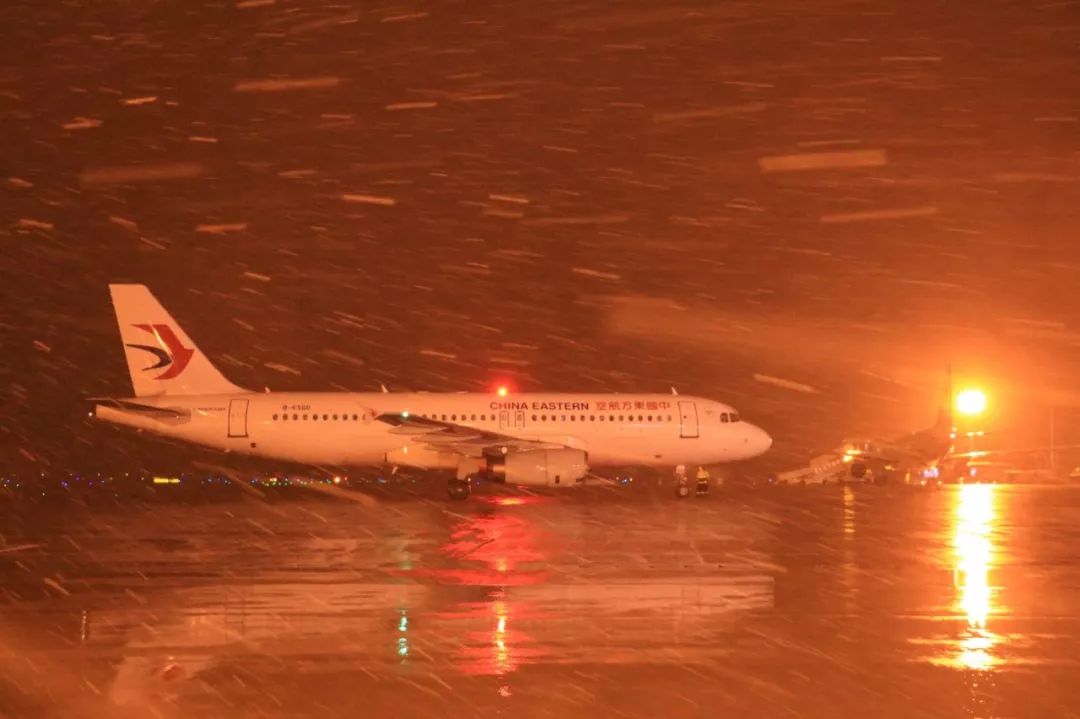 昨晚10點之后,浦東機(jī)場雪量明顯加大,圖為東航機(jī)務(wù)人員完成飛機(jī)除防冰工作后,飛機(jī)順利出港。