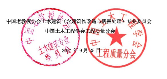 中國老教授協(xié)會土木建筑(含建筑物改造與病害處理)專業(yè)委員會與中國土木工程學(xué)會工程質(zhì)量分會定于2014年10月24~25日聯(lián)合召開第十屆建(構(gòu))筑物改造與病害處理學(xué)術(shù)研討會和第五屆工程質(zhì)量學(xué)術(shù)會議,已發(fā)出1號、2號通知,得到了業(yè)內(nèi)同行的熱烈響應(yīng),現(xiàn)將相關(guān)事項通知如下:
