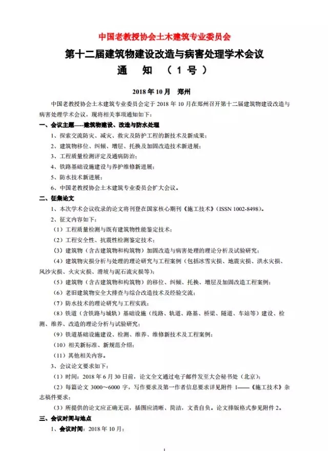 中國老教授協(xié)會土木建筑專業(yè)委員會 學(xué)術(shù)會議 2018 年 10 月 鄭州 會議介紹 中國老教授協(xié)會土木建筑專業(yè)委員會定于 2018 年 10 月在鄭州召開第十二屆建筑物建設(shè)改造與病害處理學(xué)術(shù)會議,現(xiàn)將相關(guān)事項(xiàng)通知如下: 現(xiàn)將相關(guān)事項(xiàng)通知如下: 一、會議主題—--建筑物建設(shè)、 改造與防水處理: 1、探索交流防災(zāi)、減災(zāi)、救災(zāi)及防護(hù)工程的新技術(shù)及新成果; 二、征集論文 1、 本次學(xué)術(shù)會議收錄的論文將刊登在國家核心期刊《施工技術(shù)》(ISSN 1002-8498)。 三、會議時(shí)間與地點(diǎn): 1、 會議時(shí)間: 2018 年 10 月; 四、會議資科。 會議向代表提供如下資料: 五、特別說明。 1、 論文版面費(fèi)初定每篇 500 元,每篇論文超過 8000 字者, 另行追加費(fèi)用; 六、會議主辦單位: 中國老教授協(xié)會土木建筑專業(yè)委員會, 北京交通大學(xué) 會議承辦單位: 鄭州賽諾建材有限公司 附件 1:《施工技術(shù)》雜志稿件要求